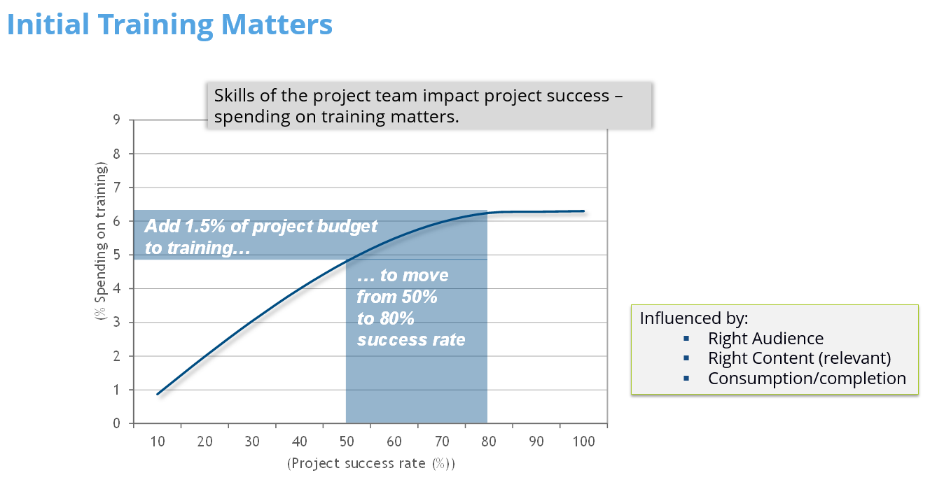 For example, if 1% of a project’s budget is allocated to training, the project success rate is less than 10%. But if you bump the training spend to 6%, you’ve increased your chance of project success to 80%.1