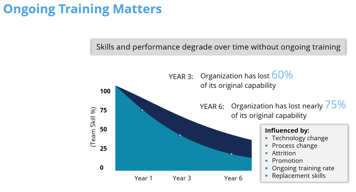According to IDC, skills and performance degrade over time without training. Even if a team is 100% upskilled, it will lose 60% of its capabilities in three years and 75% of its capabilities in six years with no additional professional development.1